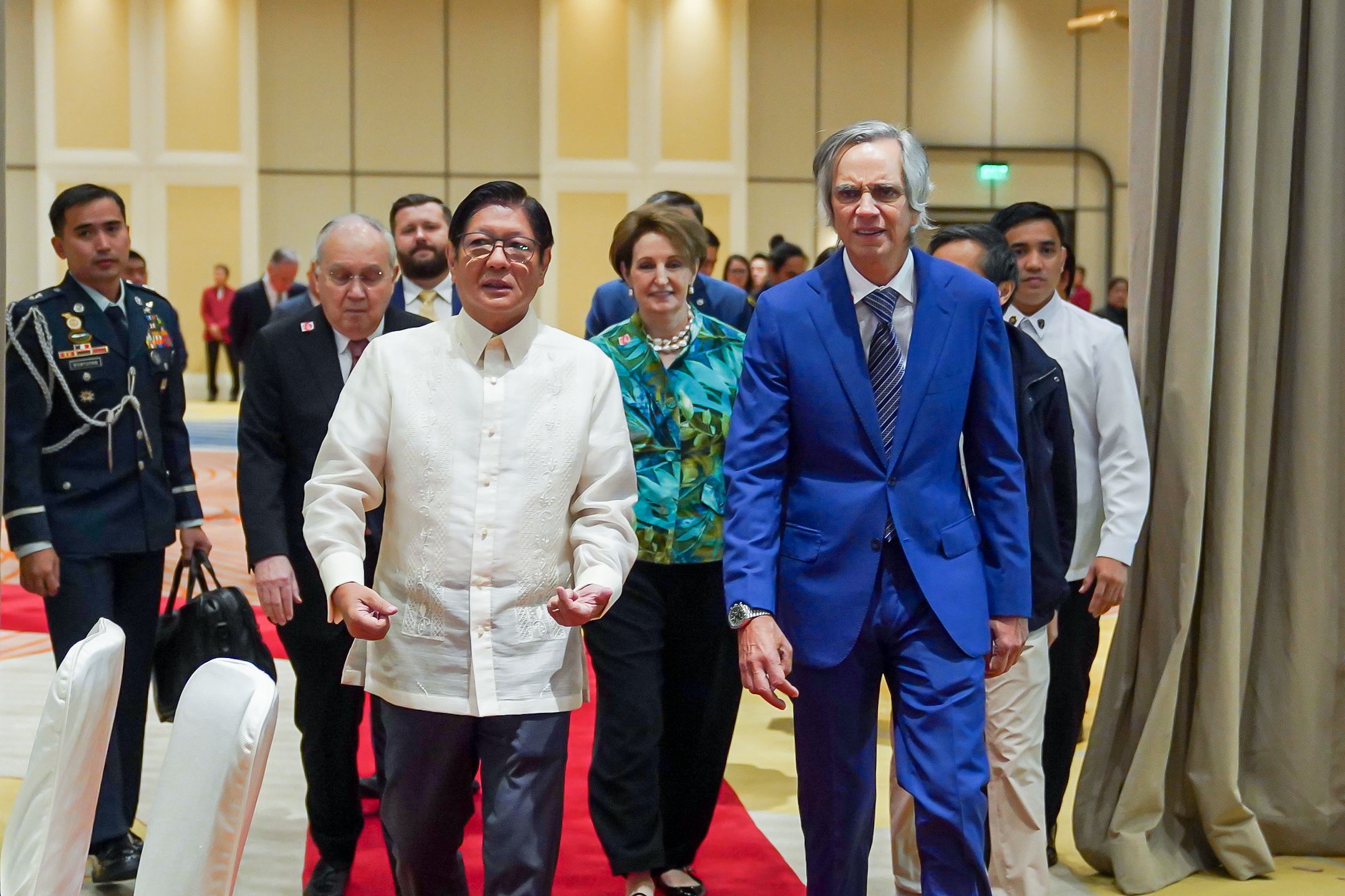 President Ferdinand Marcos, Jr. is welcomed to the Manila Strategy Forum by US-Philippines Society director Enrique Razon, Jr., Ambassador MaryKay Carlson and Ambassador Jose Manuel Romualdez, and CSIS director for Southeast Asia Program Greg Poling, 10 Sept 2025. Photo courtesy of the Presidential Communications Office